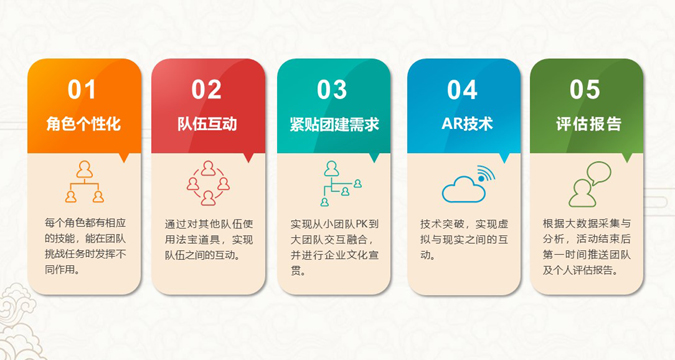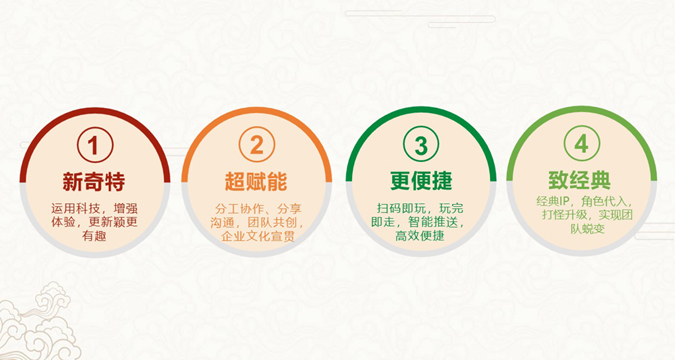 西游記是我們耳熟能詳?shù)慕?jīng)典IP,該產(chǎn)品把西游元素引入團(tuán)建活動(dòng)中,借助先進(jìn)的互聯(lián)網(wǎng)技術(shù),通過線上操作+線下體驗(yàn)融入AR虛擬+現(xiàn)實(shí)技術(shù),還原西游取經(jīng)關(guān)卡挑戰(zhàn),給團(tuán)隊(duì)帶來一場沉浸式的體驗(yàn),激發(fā)團(tuán)隊(duì)活力,提升團(tuán)隊(duì)效能。