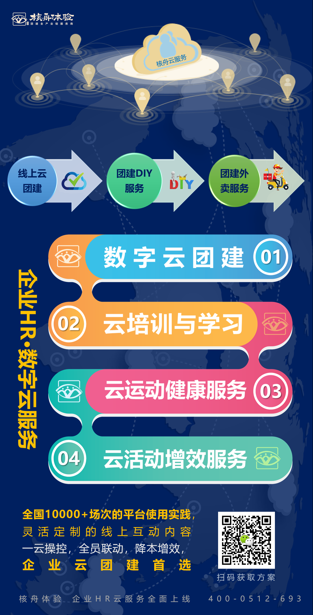 企業(yè)HR·數(shù)字云服務(wù)包括四大版塊:數(shù)字云團(tuán)建、云培訓(xùn)與學(xué)習(xí)、云運(yùn)動與健康服務(wù)、云活動增效服務(wù)。